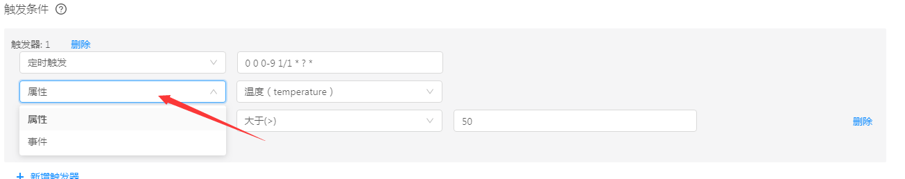 设置完成后,还可以选择其他基于物模型的触发条件,如事件、属性等。
