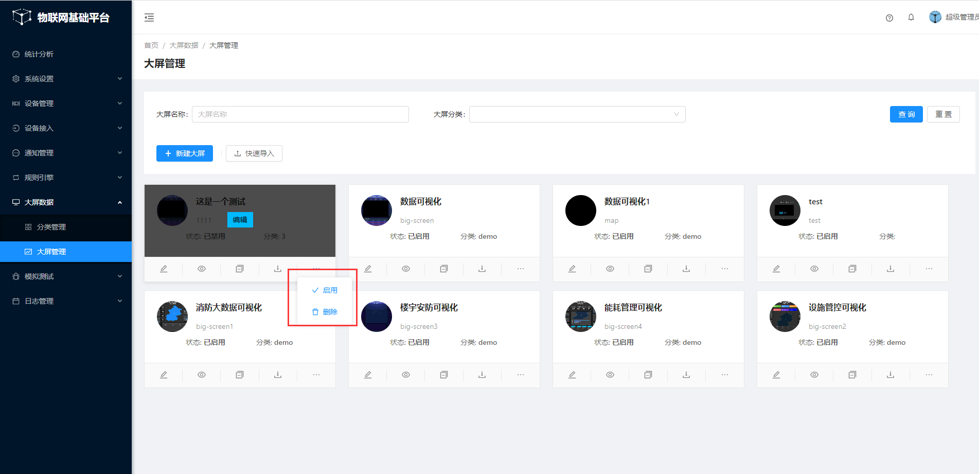 在平台大屏管理页面中,选择一个可视化应用,单击快速导入图标,可以把下载下来的可视化应用导入进平台。