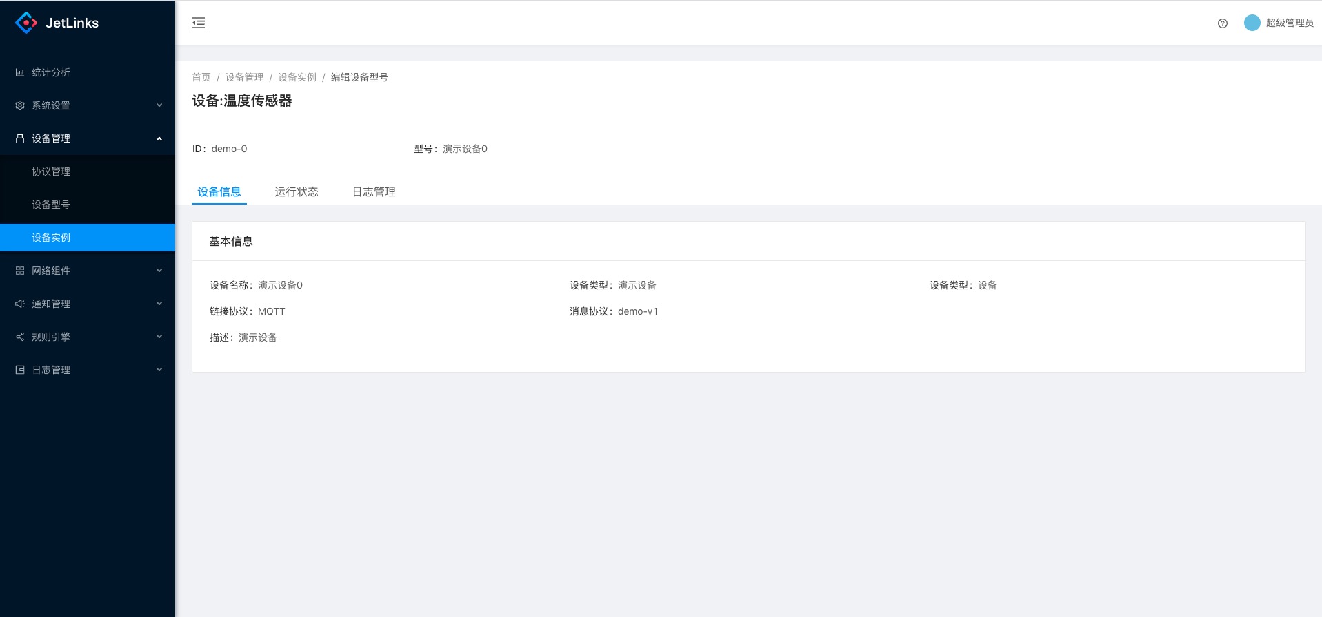 进入设备,点击查看demo-0设备,点击运行状态,可看到设备上报的数据.